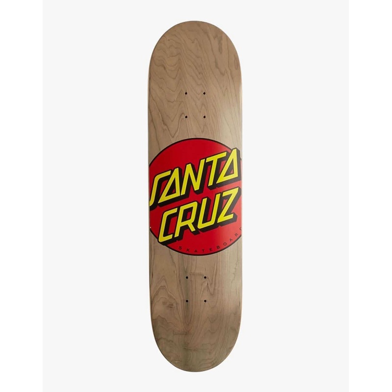 The Dot board from Santa Cruz features the Santa Cruz Dot logo in the centre of the board with a wood grain background. This deck is available in an array of sizes.